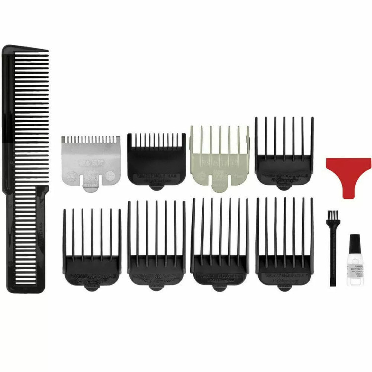 اقلام همراه:اداپتور برق/8 عدد شانه فلزی اصلاح/شانه حالت دهنده/روغن/ برس تمیز کننده/محافظ تیغه/برس تمیز کننده