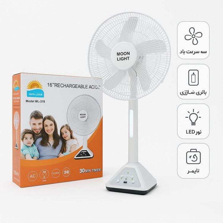 پنکه شارژی برقی مون لایت مدل ML-317 نوع دستگاه : پنکه شارژی و برقی زمان کارکرد بدون برق : 8ساعت دارای : چراغ ال یدی دارای خروجی : USBبرای شارژ قابلیت : 3 سرعت متفاوت باتری : اسید سرب 6 ولت و 5امپر اندازه پرها : 16 اینج